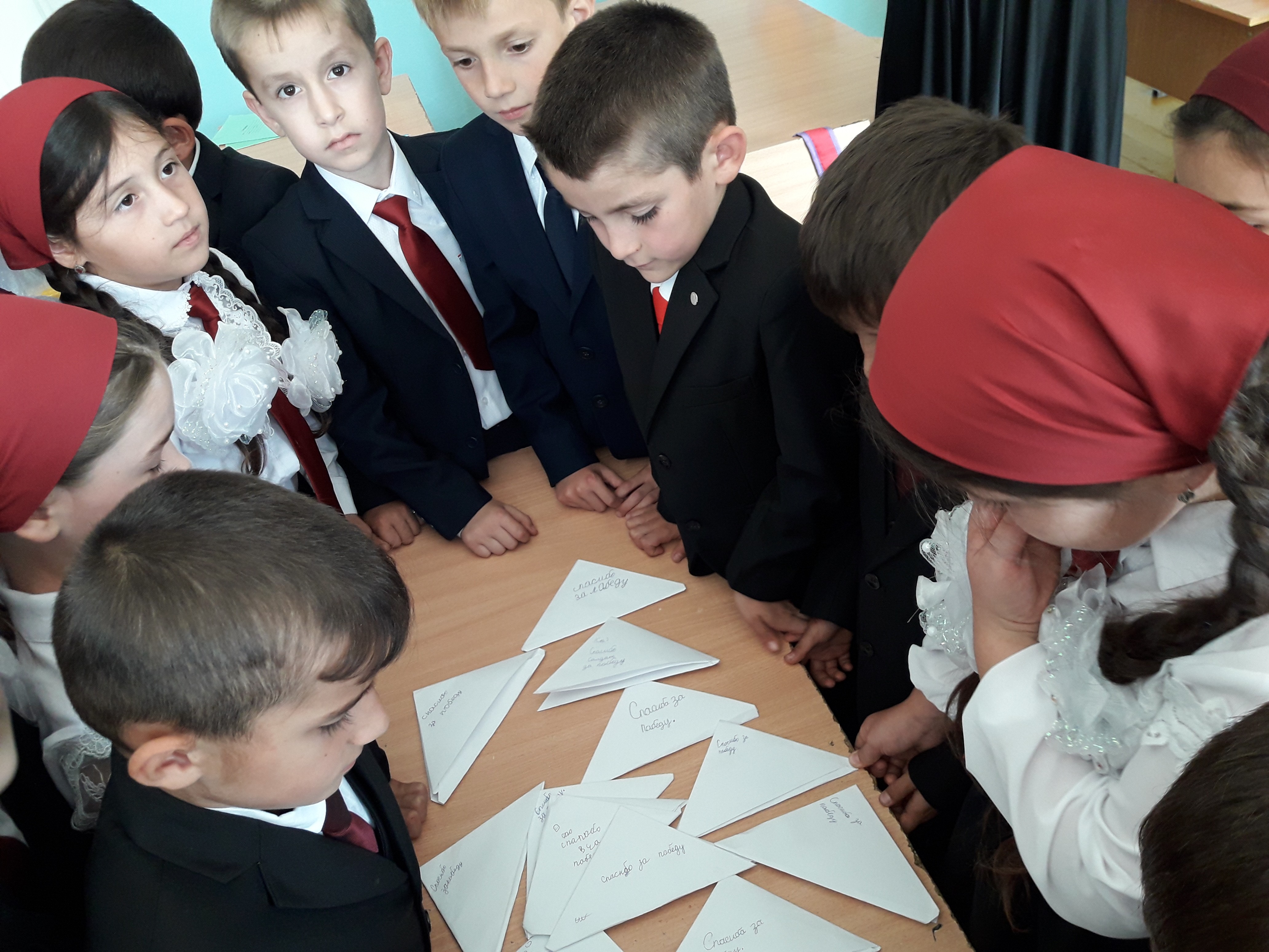 Ребята пишут письма солдату Победы-треугольники"Спасибо за победу"
