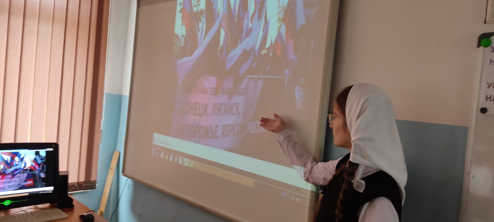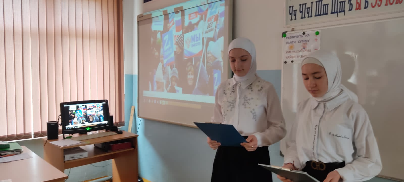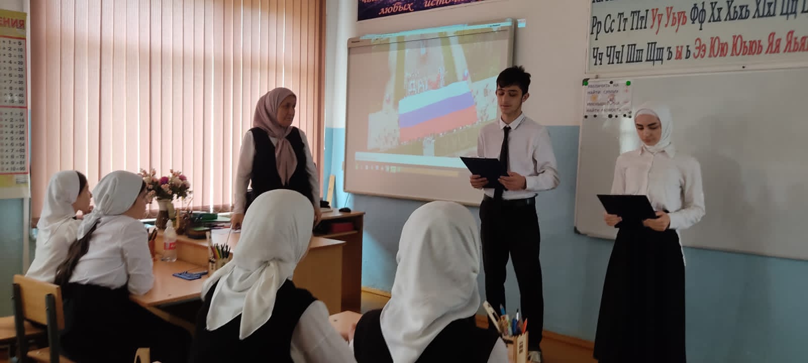 В МБОУ «СОШ № 2 с. Ножай-Юрт» прошёл информационный час «Пока мы едины - мы непобедимы!». Ребята с интересом слушали рассказ об истории самого молодого праздника России, рассуждали о том, что нам всем необходимо поддерживать и помогать жителям новых российских регионов.