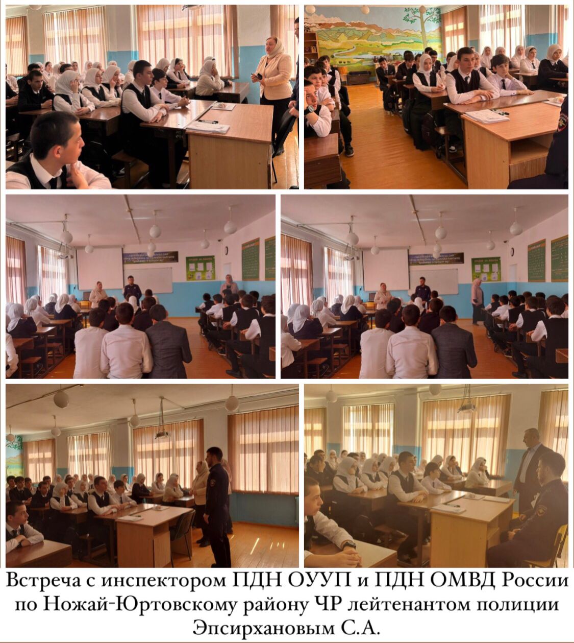 13.03.2025В МБОУ,,СОШ 2с.Ножай-Юрт"состоялась профилактическая беседа со старшим инспектором ПДН ОУУП и ПДН ОМВД России по Ножай-Юртовскому району ЧР лейтенантом полиции Эпсирхановым С.А.В разговоре с обучающимися инспектор затронул следующие темы:,,Административные правонарушения и преступления среди несовершеннолетних", ,,Соблюдение правил в общественных местах", ,,Здоровый образ жизни".В своей беседе коснулся вопросов ответственности за совершение таких преступлений,как кража,грабёж,вымогательство,причинение телесных повреждений.В ходе встречи инспектор рассказал о том,с какого возраста наступает уголовная и административная ответственность,и отметил,что неправомерное поведение подростков отрицательно сказывается на их будущем,поскольку за это они ставятся на профилактический учёт и контролируются сотрудниками полиции.А в дальнейшем у тех, кто состоял на учёте,могут возникнуть проблемы при приёме на службу в армию,на работу и т.д.Настоятельно рекомендовал соблюдать правила поведения на улице,на дороге, в общественных местах.Педагог-психолог Войсуева Т.У.